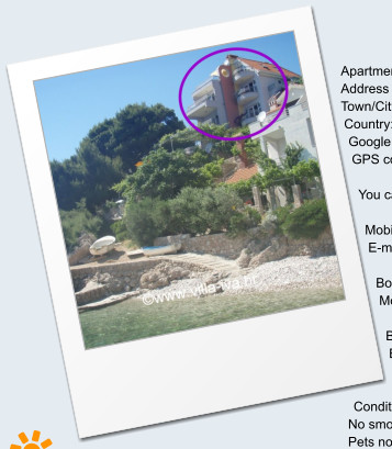 Apartments Villa Iva ***Address : Tice I Nr.28Town/City: Stanici, 21310 P.P.Country: CroatiaGoogle map: LinkGPS coordinates: 43.41331, 16.72772You can contat us by : Mobile: +385 91 225 9266 Mario(please use whats up)E-mail: mariucci433@gmail.comBooth apartments are rented as one unit ! Monthy discount -50% , June / September discount -20%Booking Terms: Bookings cancelled prior to 21 days will incur a 25% cancellation fee.Cancellations within 21 days will incur a 100% cancellation fee. Conditions of Use No smoking in apartments. Pets not permitted. Check-in times: 2pm Check-out times: 10am